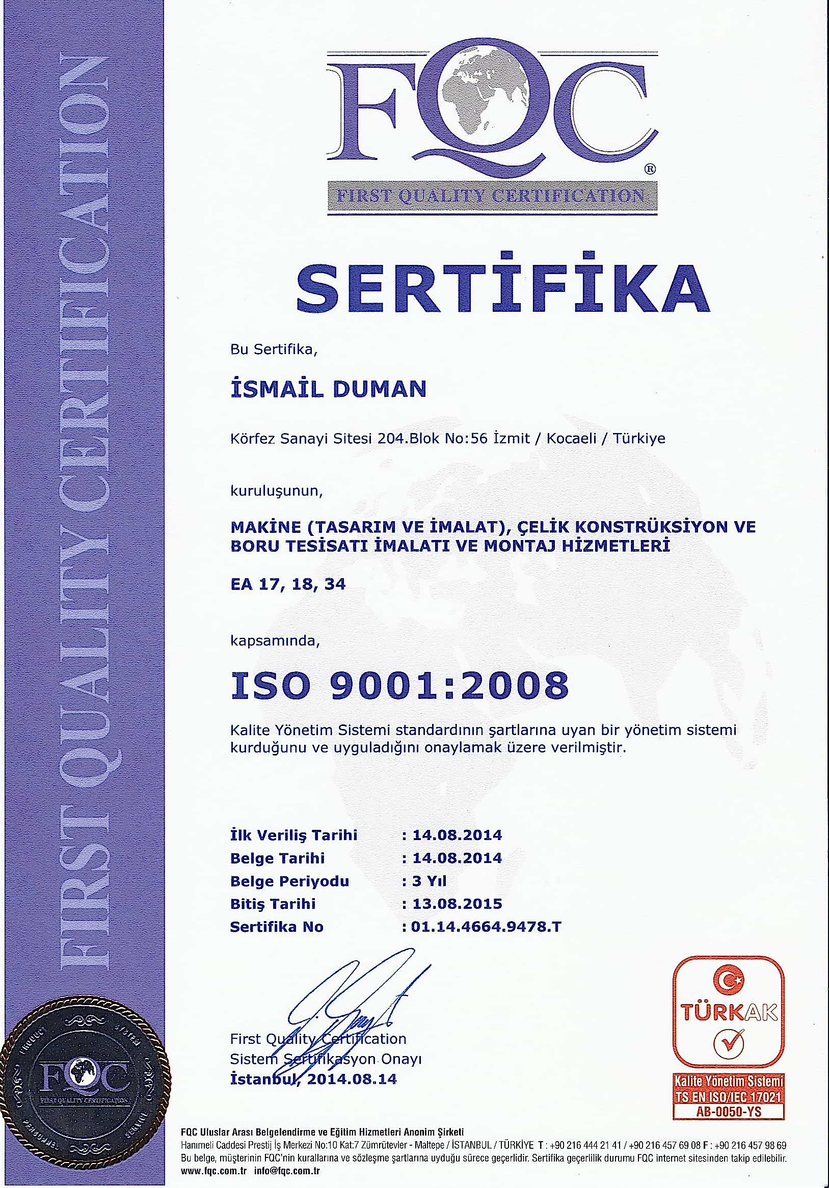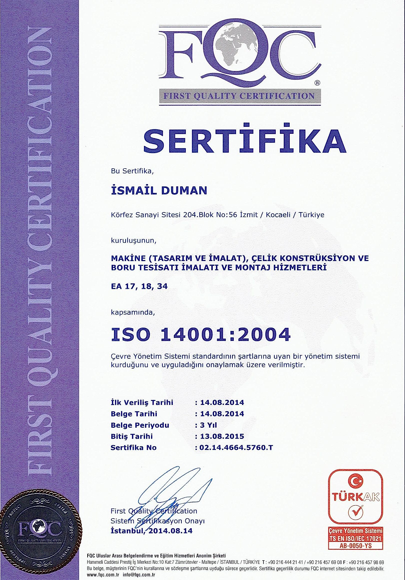 ISO 9001:2008 Kalite Belgesi | ISO 14001:2004 Çevre Yönetim Sistemleri |
